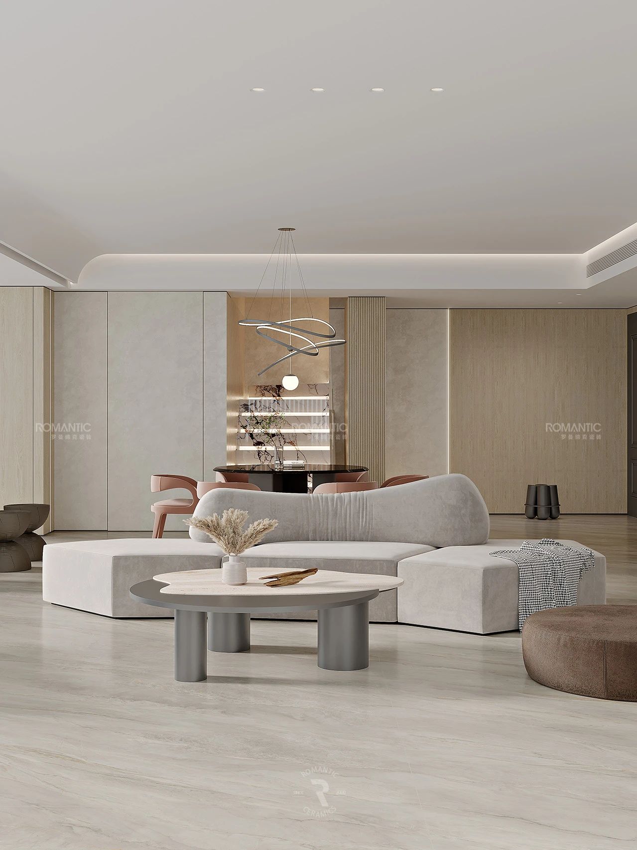 自然獨紋,詮釋靈動美學,秉承天然粉晶的形成邏輯,每片瓷磚獨立生成完整而靈動的流云紋路,通過精妙設計